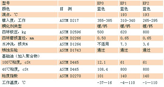 重型设备润滑脂混合专有的浅色固体润滑剂,增强润滑脂的极压抗磨性能,比二硫化钼或石墨的抗磨润滑性能更好。精选的添加剂更能提高润滑油膜的强度和粘附性,进一步提高对机械设备的润滑保护作用。工作温度使用范围从-37℃至110℃。